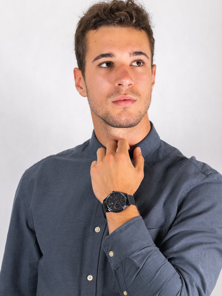 This Tommy Hilfiger Men’s watch is an modern elegant sporty everyday design. Part of the Damon collection and fitted with an ionised navy stainless steel , 44mm case and metal bracelet. The watch has a navy chronograph dial and a water resistancy of 50 metres meaning it is suitable for showering and swimming. The watch is dispatched with a full 2 Year manufacturers warranty, presentation box and gift bag.