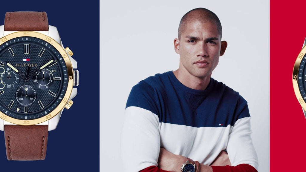 Men’s watch from Tommy Hilfiger. Featuring a 46mm gold plated case, blue diamond textured semi-gloss dial and light brown leather strap.