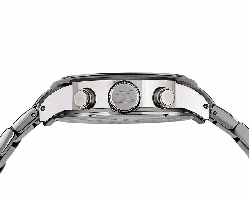 With this distinctive TOMMY HILFIGER men's watch, no one will miss you. The high-quality steel design has a black dial that displays the date, day of the week and 24-hour time. Be in with this modern piece.