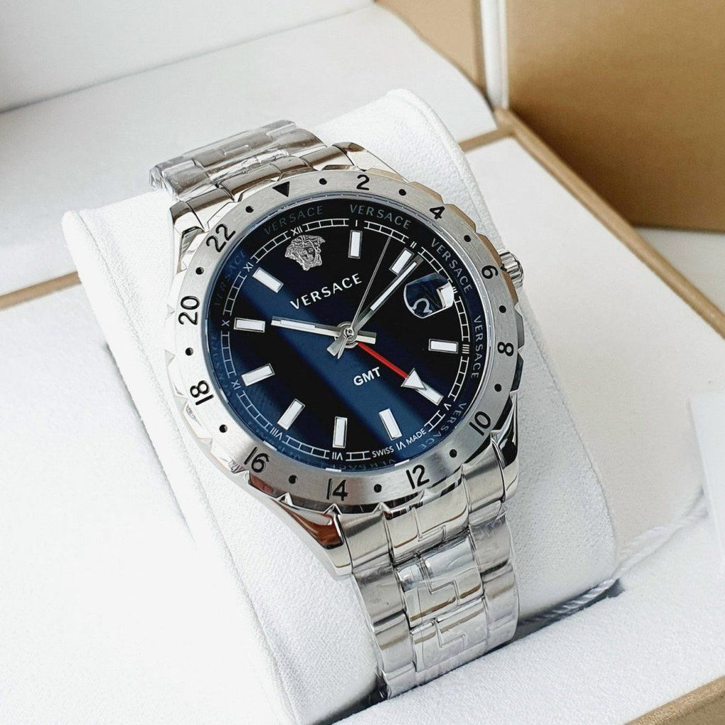 Versace Hellenyium GMT Black Dial Silver Steel Strap Watch for Men - V11020015