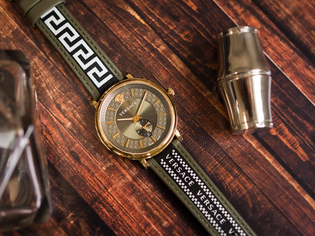Gold ion-plated stainless steel case with a green leather strap with a black nylon center. Fixed gold ion-plated bezel. Green (greca embossed) dial with luminous gold-tone hands and index hour markers. The Medusa Head logo appears at the 12 o'clock position. Dial Type: Analog. Luminescent hands.