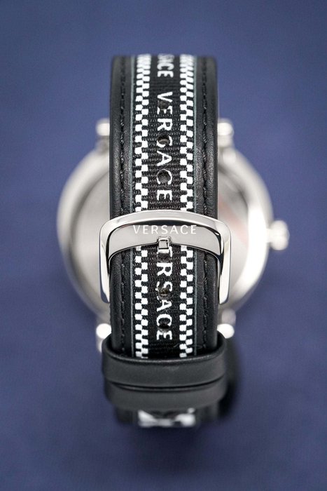 Silver textured dial with silver indexes and hands – Medusa Head at 12 – Date/Subseconds at 6.